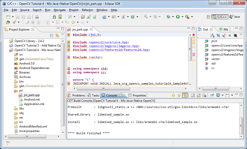 project.properties is a text file containing information about target Android platform and other build details. This file is generated by Eclipse or can be created with android tool included in Android SDK.AndroidManifest.xml and project.properties files are required to compile the C++ part of the application, since Android NDK build system relies on them. If any of these files does not exist, compile the Java part of the project before the C++ part.Android.mk and Application.mk scripts The script Android.mk usually has the following structure: