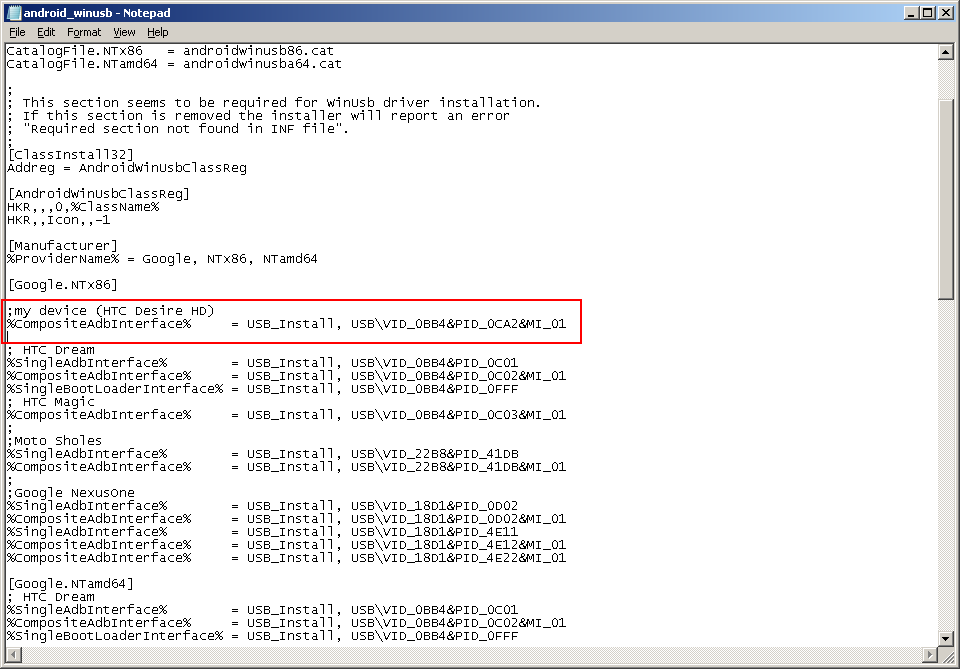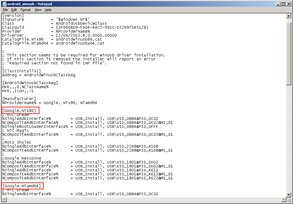Now open file <Android SDK folder>/extras/google/usb_driver/android_winusb.inf. Select either Google.NTx86 or Google.NTamd64 section depending on your host system architecture.