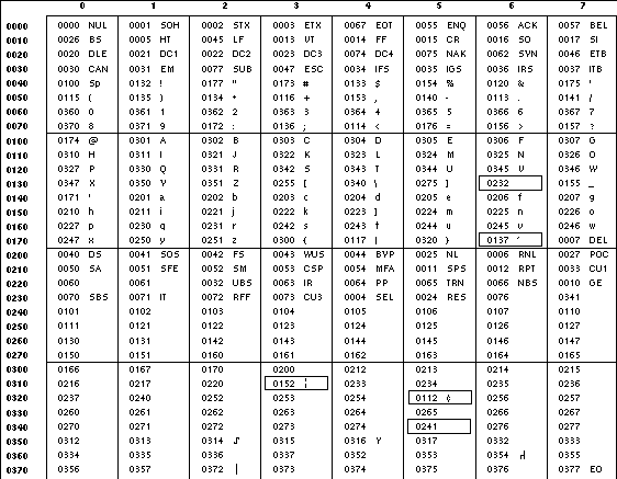 The following two tables display the octal number character values used for the ascii and ebcdic conversions (first table) and for the ibm conversion (second table). In both tables, the ASCII values are the row and column headers and the EBCDIC values are found at their intersections. For example, ASCII 0012 (LF) is the second row, third column, yielding 0045 in EBCDIC. The inverted tables (for EBCDIC to ASCII conversion) are not shown, but are in one-to-one correspondence with these tables. The differences between the two tables are highlighted by small boxes drawn around five entries.