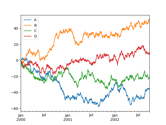 In [136]: df = pd.DataFrame(np.random.randn(1000, 4), index=ts.index, .....: columns=['A', 'B', 'C', 'D']) .....: In [137]: df = df.cumsum() In [138]: plt.figure() Out[138]: <Figure size 640x480 with 0 Axes> In [139]: df.plot() Out[139]: <matplotlib.axes._subplots.AxesSubplot at 0x7f35539b41d0> In [140]: plt.legend(loc='best') Out[140]: <matplotlib.legend.Legend at 0x7f35539b0a50>