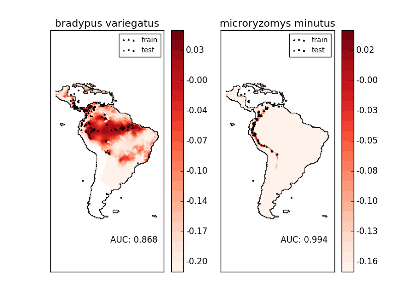 Modeling species’ geographic distributions is an important problem in conservation biology. In this example we model the geographic distribution of two south american mammals given past observations and 14 environmental variables. Since we have only positive examples (there are no unsuccessful observations), we cast this problem as a density estimation problem and use the OneClassSVM provided by the package sklearn.svm as our modeling tool. The dataset is provided by Phillips et. al. (2006). If available, the example uses basemap to plot the coast lines and national boundaries of South America.
