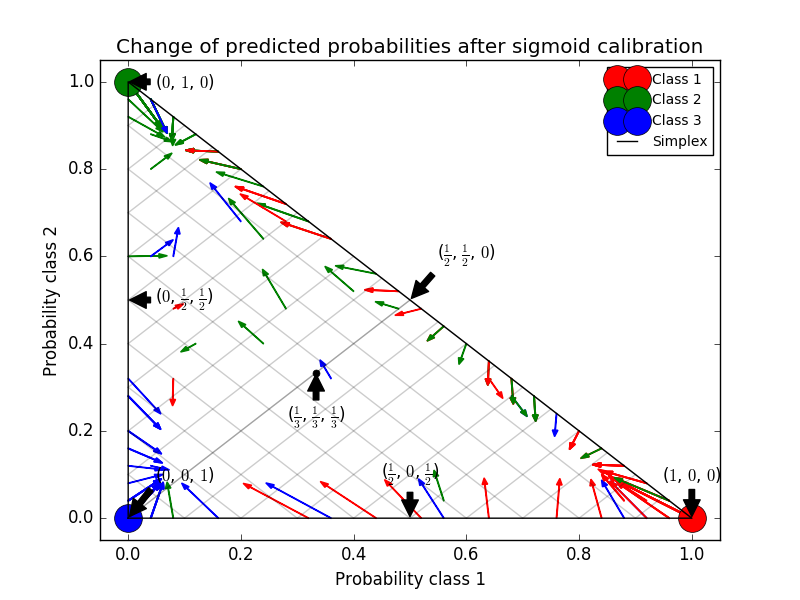 This example illustrates how sigmoid calibration changes predicted probabilities for a 3-class classification problem. Illustrated is the standard 2-simplex, where the three corners correspond to the three classes. Arrows point from the probability vectors predicted by an uncalibrated classifier to the probability vectors predicted by the same classifier after sigmoid calibration on a hold-out validation set. Colors indicate the true class of an instance (red: class 1, green: class 2, blue: class 3).