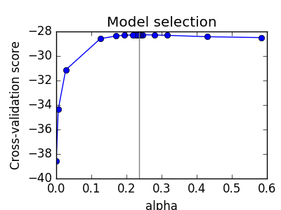 The alpha parameter of the GraphLasso setting the sparsity of the model is set by internal cross-validation in the GraphLassoCV. As can be seen on figure 2, the grid to compute the cross-validation score is iteratively refined in the neighborhood of the maximum.