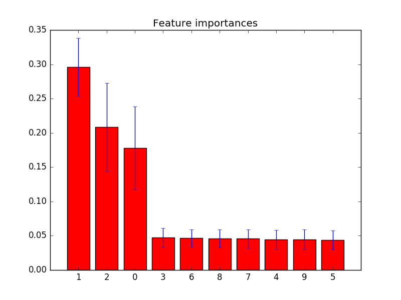 This examples shows the use of forests of trees to evaluate the importance of features on an artificial classification task. The red bars are the feature importances of the forest, along with their inter-trees variability.