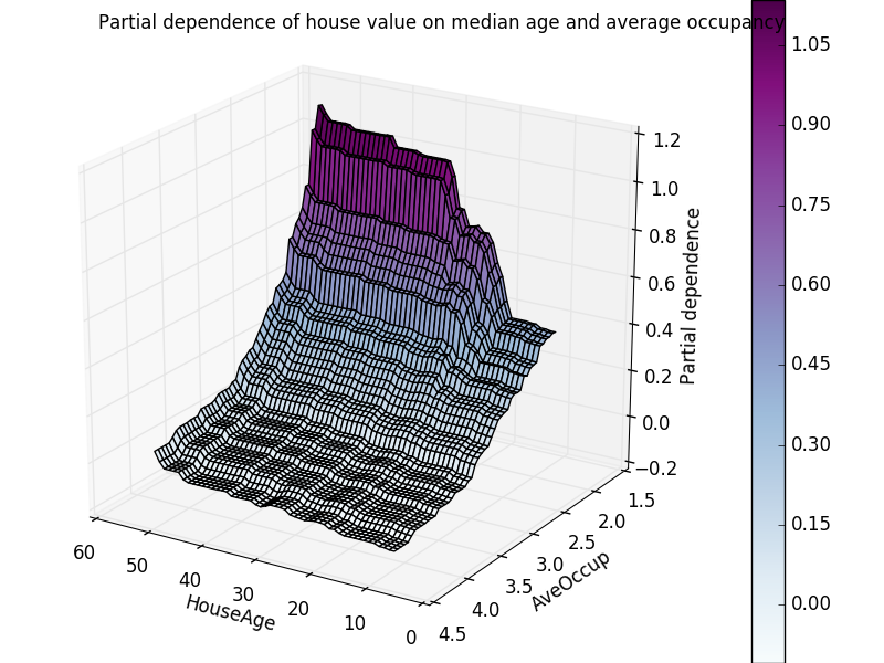 Partial dependence plots with two target features enable us to visualize interactions among them. The two-way partial dependence plot shows the dependence of median house price on joint values of house age and avg. occupants per household. We can clearly see an interaction between the two features: For an avg. occupancy greater than two, the house price is nearly independent of the house age, whereas for values less than two there is a strong dependence on age.
