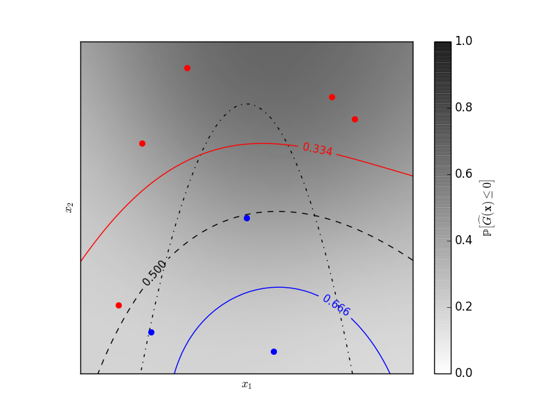 cb.set_label('${\\rm \mathbb{P}}\left[\widehat{G}(\mathbf{x}) \leq 0\\right]$')