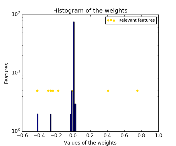 The histogram of the estimated weights is very peaked, as a sparsity-inducing prior is implied on the weights.