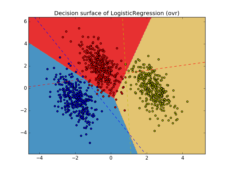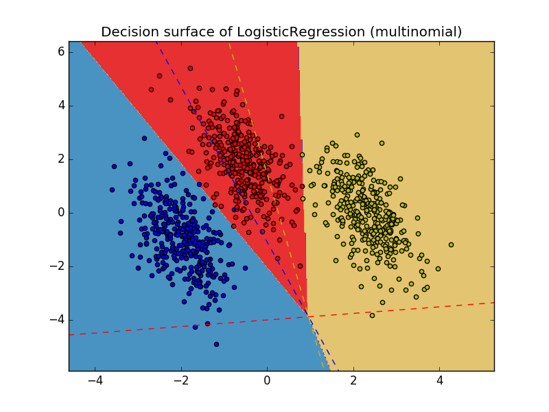 Plot decision surface of multinomial and One-vs-Rest Logistic Regression. The hyperplanes corresponding to the three One-vs-Rest (OVR) classifiers are represented by the dashed lines.