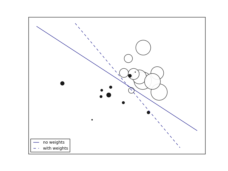 Plot decision function of a weighted dataset, where the size of points is proportional to its weight.
