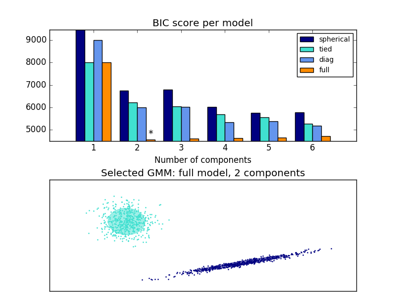 This example shows that model selection can be performed with Gaussian Mixture Models using information-theoretic criteria (BIC). Model selection concerns both the covariance type and the number of components in the model. In that case, AIC also provides the right result (not shown to save time), but BIC is better suited if the problem is to identify the right model. Unlike Bayesian procedures, such inferences are prior-free.