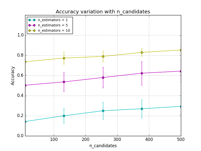 In the first plot, accuracy is measured with the number of candidates. Here, the term “number of candidates” refers to maximum bound for the number of distinct points retrieved from each tree to calculate the distances. Nearest neighbors are selected from this pool of candidates. Number of estimators is maintained at three fixed levels (1, 5, 10).