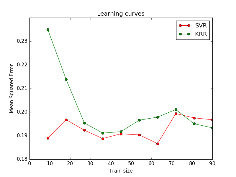The next figure compares the time for fitting and prediction of KRR and SVR for different sizes of the training set. Fitting KRR is faster than SVR for medium- sized training sets (less than 1000 samples); however, for larger training sets SVR scales better. With regard to prediction time, SVR is faster than KRR for all sizes of the training set because of the learned sparse solution. Note that the degree of sparsity and thus the prediction time depends on the parameters epsilon and C of the SVR.